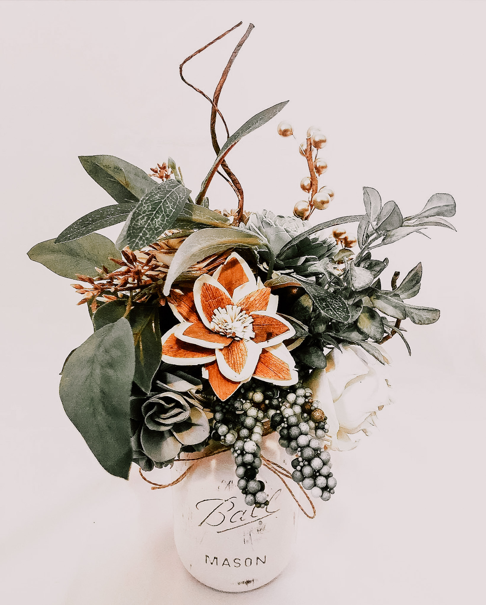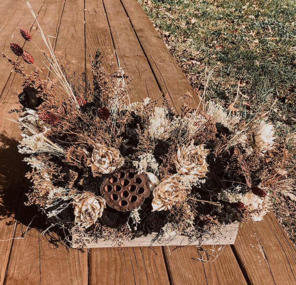 Create your dead flower arrangement by sticking the stemmed wood flowers and fillers into your wood planter box in any pattern. Snip your stems down with your wire cutters, or pruning shears as you go. Wire cutters will work better for the stemmed wood flowers, but the pruning shears will work best for the real preserved fillers, like the Caspia, Dried Phalaris Grass, Bleached Baby’s Breath, Birch Branches, and Lotus Pods used in this arrangement. If you would like the arrangement to be extra secure, you can dab hot glue at the base of the stem to keep it in place.